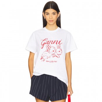 Ganni Organic Cotton White T-Shirt with Red Rabbit Print