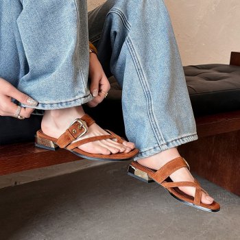 Summer Square Toe Leather Slippers with Buckle – Low Heel Flip Flops